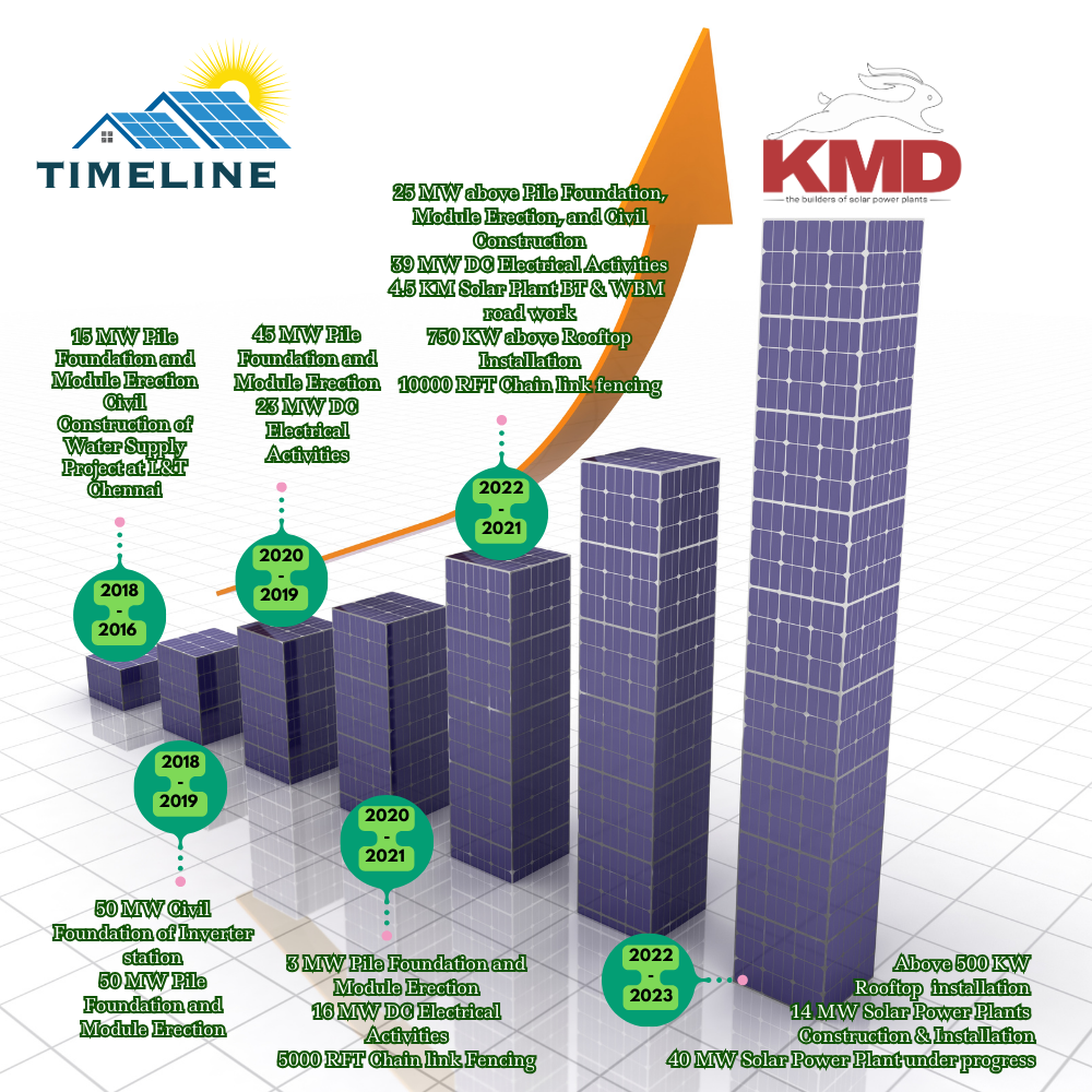 Welcome to KMD Solar Energy +, the leading division of KMD Developers dedicated to the solar power field. Since our establishment in 2017, we have been committed to building a green future by providing reliable and quality solar power solutions. With our expert knowledge, skilled workforce, and a focus on customer satisfaction, we have successfully served various industry power requirements through ground and rooftop projects. Our services encompass everything from pile foundations and solar module erection to electrical DC and AC activities, rooftop installations, and commissioning.